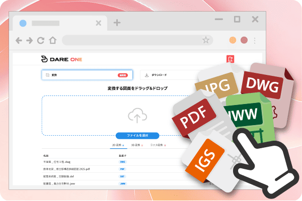 — DWG は AutoCAD を中心に幅広いCADソフトで利用される代表的な図面形式です。建築・機械・設備分野など多くの業界で使われ、設計データの受け渡しにも欠かせません。DARE ONE では、DWG ファイルを DXF・JWW・SXF などに変換可能です。